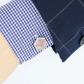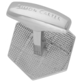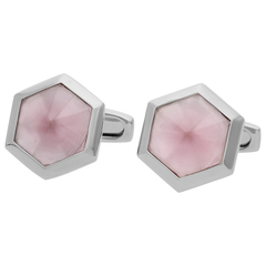 ヘキサゴンプレートに、ピンクのキャッツアイを埋め込んだシャープ感があるカフス(カフスボタン)です。キャッツアイは、六角形にカットされ輝き方に変化があります。素材上、個体差がございます。